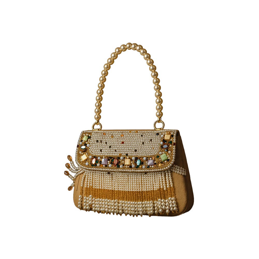 This handbag features a richly decorated front flap adorned with pearls and multicolored embellishments, complemented by a pearl handle that enhances its classic appeal. The structured body ensures durability while maintaining a graceful and luxurious look.