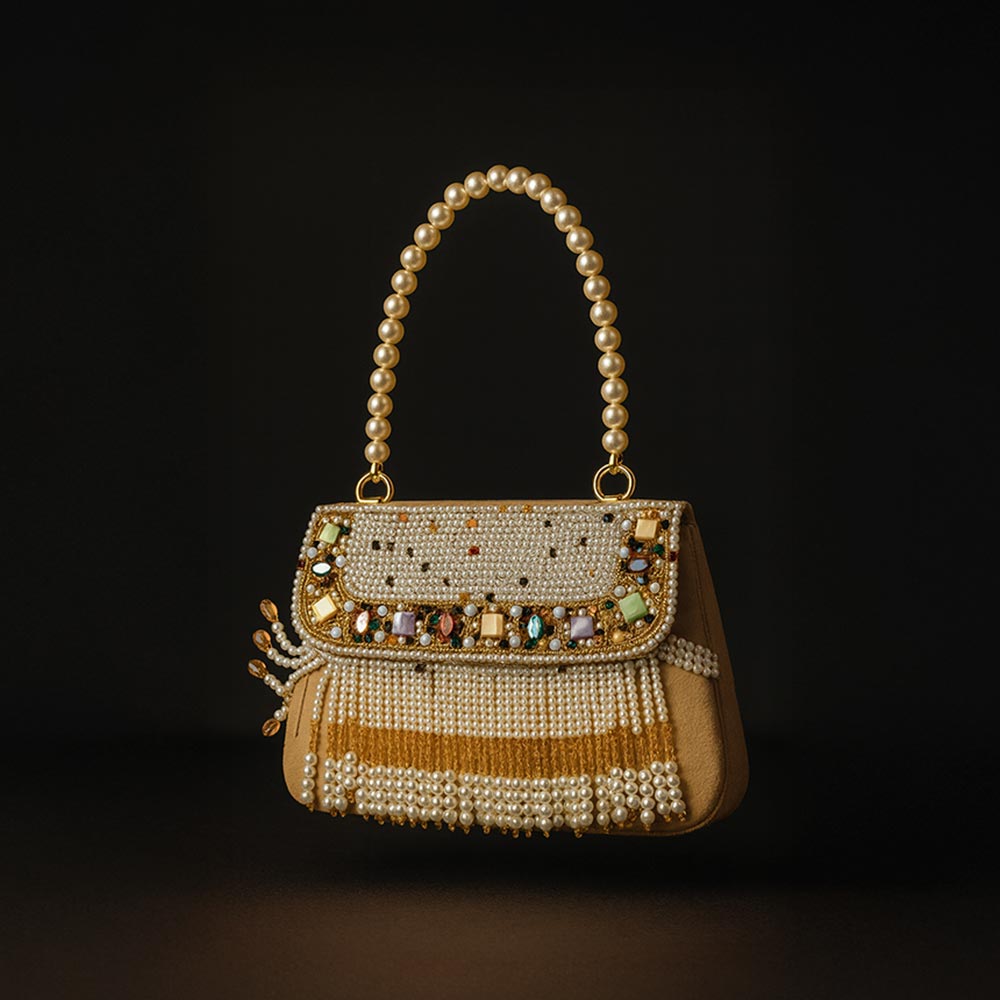 Add timeless elegance to your festive wardrobe with this beautifully crafted pearl-embellished handbag. Designed with intricate detailing and a refined silhouette, this handbag is perfect for special occasions and traditional celebrations.